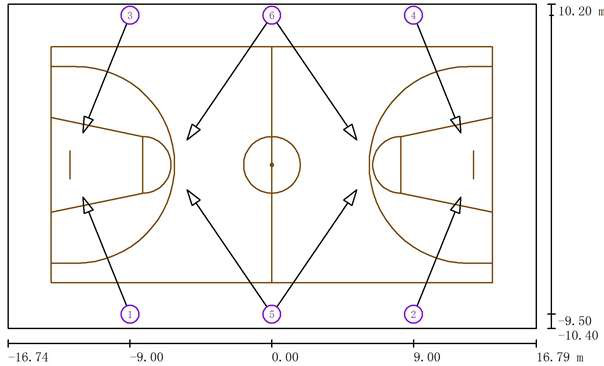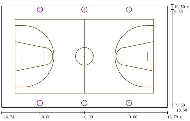 如上圖所示,場(chǎng)地布置6根8米燈桿,燈桿布置在場(chǎng)地兩側(cè)。
