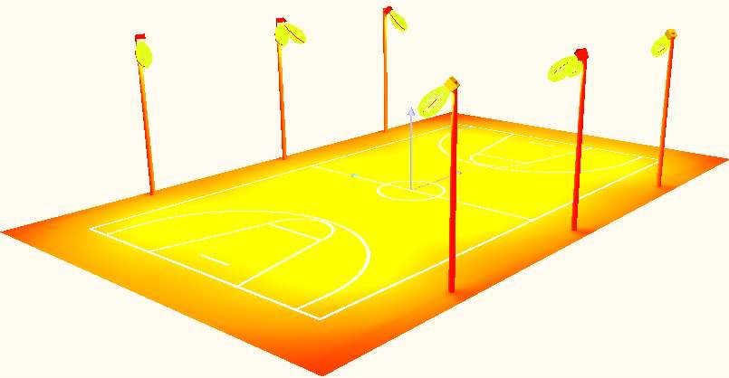 建議使用我司280W LED球場(chǎng)燈,共8盞280W LED球場(chǎng)燈,燈桿布燈,在場(chǎng)地兩側(cè)共布置6根燈桿,燈具安裝高度8米;開(kāi)啟場(chǎng)地?zé)艄夂,籃球場(chǎng)平均照度260LUX左右,滿(mǎn)足訓(xùn)練照度要求。