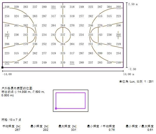 開(kāi)啟該場(chǎng)地8盞280W ,換LED球場(chǎng)燈后,籃球場(chǎng)大部分區(qū)域的照度都在250lux左右,平均照度達(dá)到267lux,最大照度達(dá)到331lux,滿(mǎn)足訓(xùn)練照明要求。